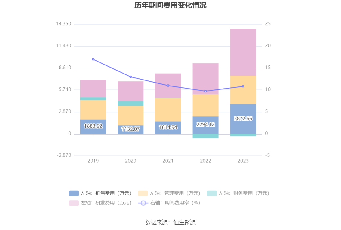 2023年,公司期间费用为1.34亿元,较上年同期增加4807.73万元;期间费用率为10.81%,较上年同期上升1.11个百分点。其中,销售费用同比增长68.8%,管理费用同比增长30.48%,研发费用同比增长51.35%,财务费用由去年同期的-586.22万元变为-318.05万元。
