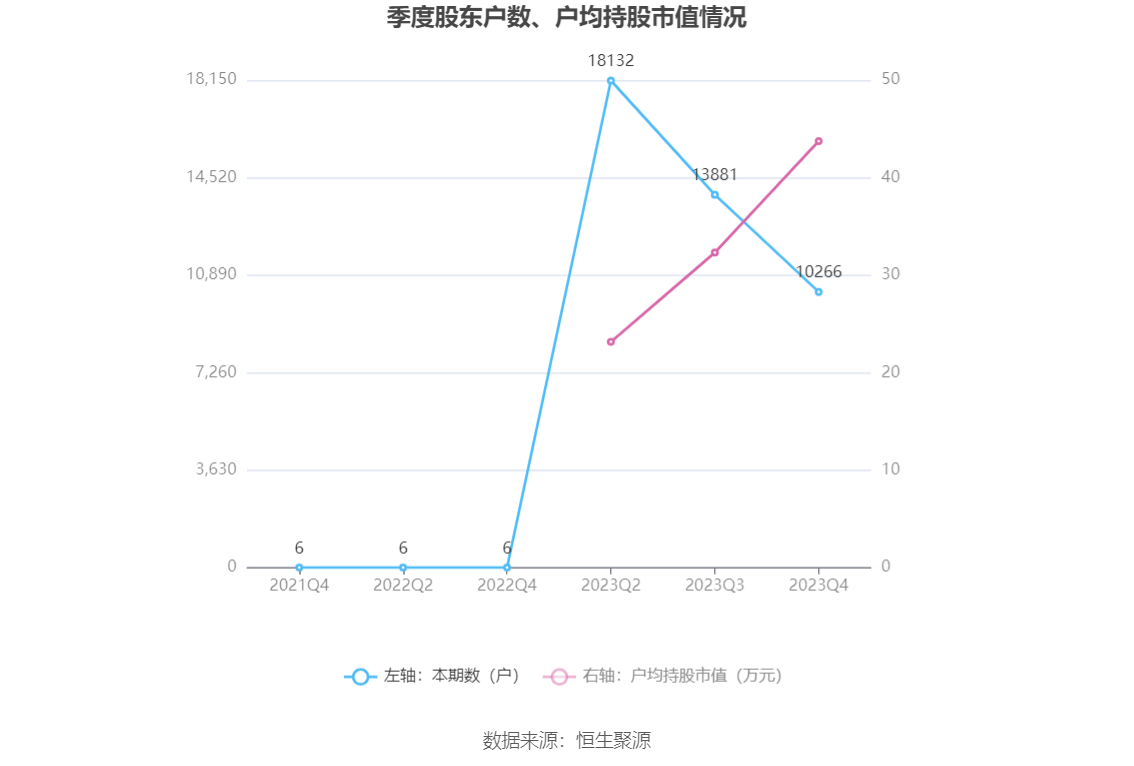 筹码集中度方面,截至2023年年末,公司股东总户数为1.03万户,较三季度末下降了3615户,降幅26.04%;户均持股市值由三季度末的32.31万元上升至43.74万元,增幅为35.38%。