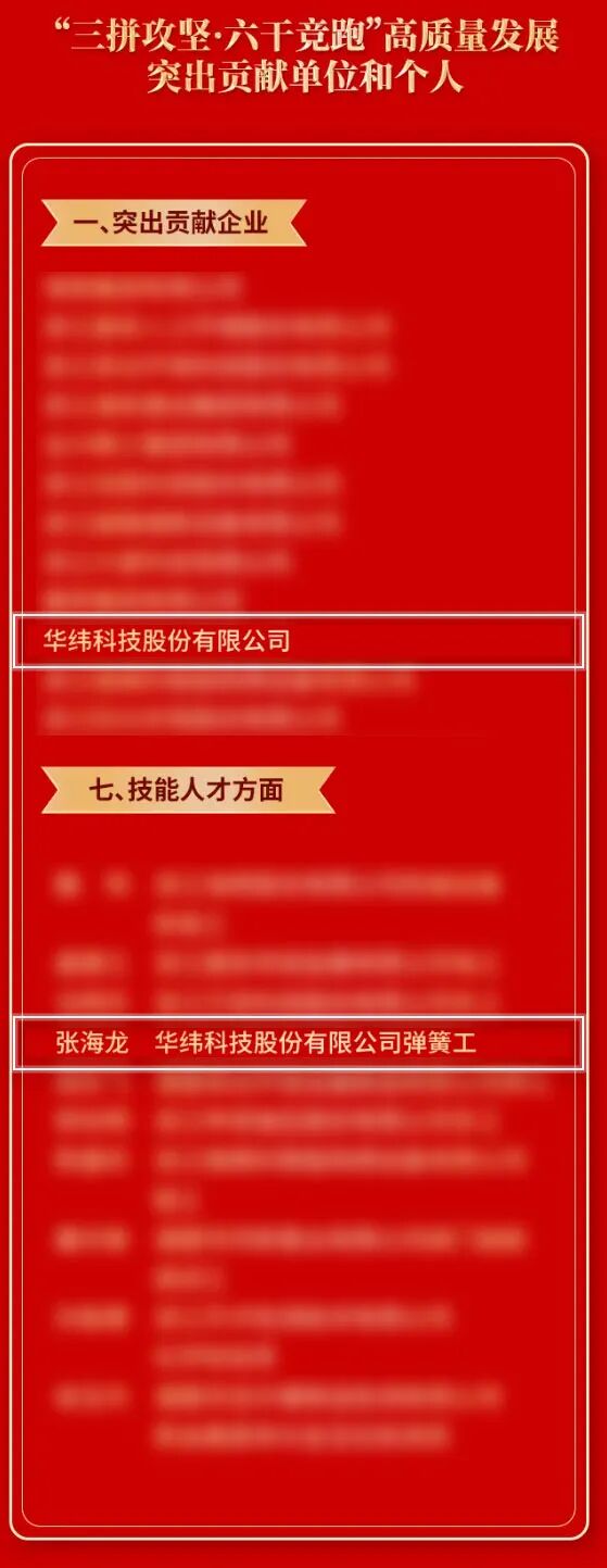 2月27日,全市工业高质量发展大会暨营商环境优化部署会隆重召开。华纬科技股份有限公司凭借深耕高端弹性元件领域的坚守与创新、推动产业高质量发展的突出成效,荣获“三拼攻坚·六干竞跑”高质量发展突出贡献集体称号;公司弹簧工张海龙同志,以精益求精的工匠精神、扎根一线的责任担当,荣获“三拼攻坚·六干竞跑”高质量发展突出贡献个人称号(技能人才方面)。集体+个人双项表彰,是市委、市政府对华纬科技发展成果与员工风采的高度肯定!
