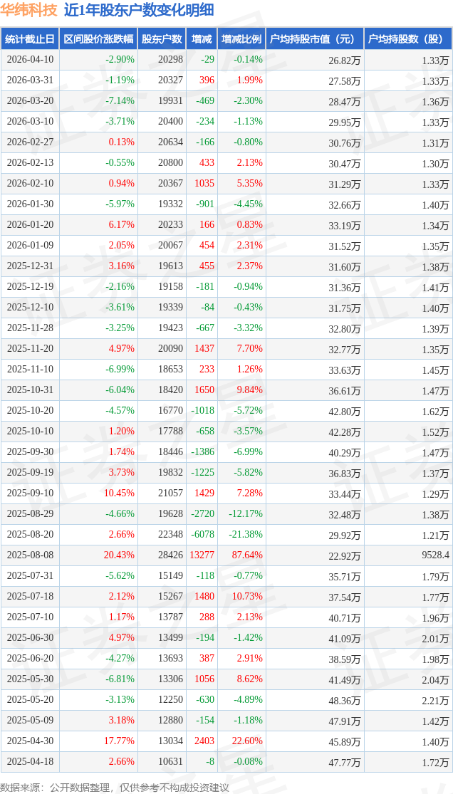 近日华纬科技披露,截至2026年4月10日公司股东户数为2.03万户,较3月31日减少29.0户,减幅为0.14%。户均持股数量由上期的1.33万股增加至1.33万股,户均持股市值为26.82万元。