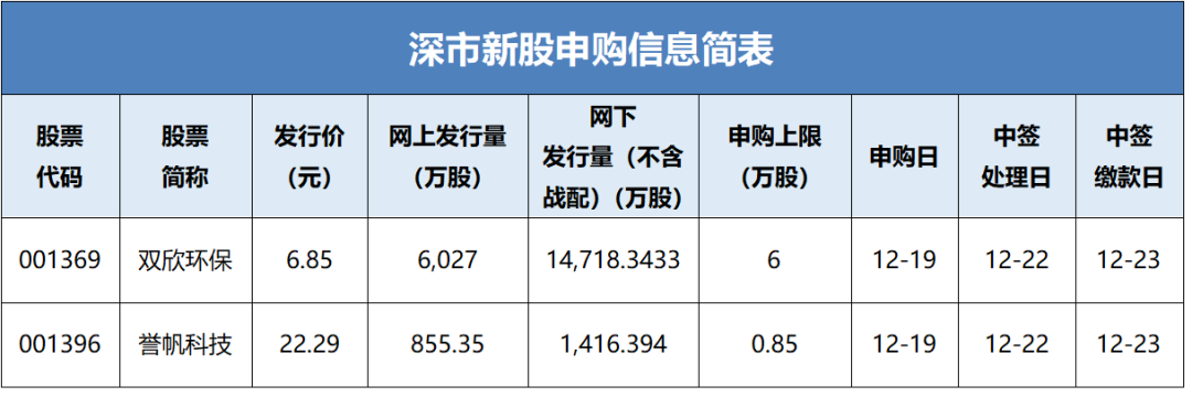 2025年12月19日,内蒙古双欣环保材料股份有限公司(简称:双欣环保)、上海誉帆环境科技股份有限公司(简称:誉帆科技)将通过深交所网下发行电子平台和交易系统发行新股,具体信息如下。