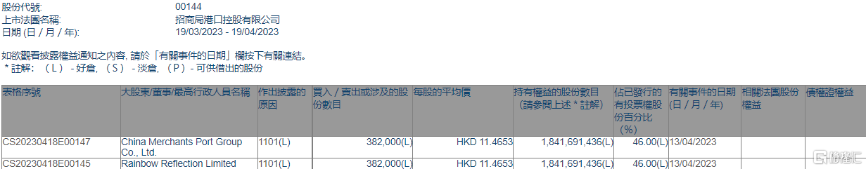 根据联交所最新权益披露资料显示,2023年4月13日,招商局港口(00144.HK)获China Merchants Port Group Co., Ltd.在场内以每股均价11.4653港元增持38.2万股,涉资约437.97万港元。