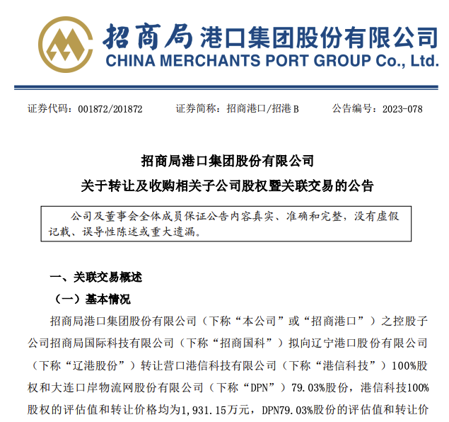 9月26日,招商港口(001872)(001872.SZ)公告,公司控股子公司招商局国际科技有限公司(“招商国科”)拟向辽港股份(601880)转让营口港(600317)信科技有限公司(“港信科技”)100%股权和大连口岸物流网股份有限公司(“DPN”)79.03%股份,港信科技100%股权的评估值和转让价格均为1931.15万元,DPN79.03%股份的评估值和转让价格均为6371.60万元,转让价款合计8302.75万元。公司拟收购大连港集装箱发展有限公司(“大港集箱”)、大连港集发物流有限责任公司(“集发物流”)以及营口港务集团有限公司(“营口港集团”)分别持有的22.3779%、13.2563%和7.4495%(合计43.0837%)招商国科股权,收购价款合计1.1亿元。交易完成后,招商港口直接及间接控制招商国科100%股权,港信科技、DPN不再是公司合并报表范围内的子公司。