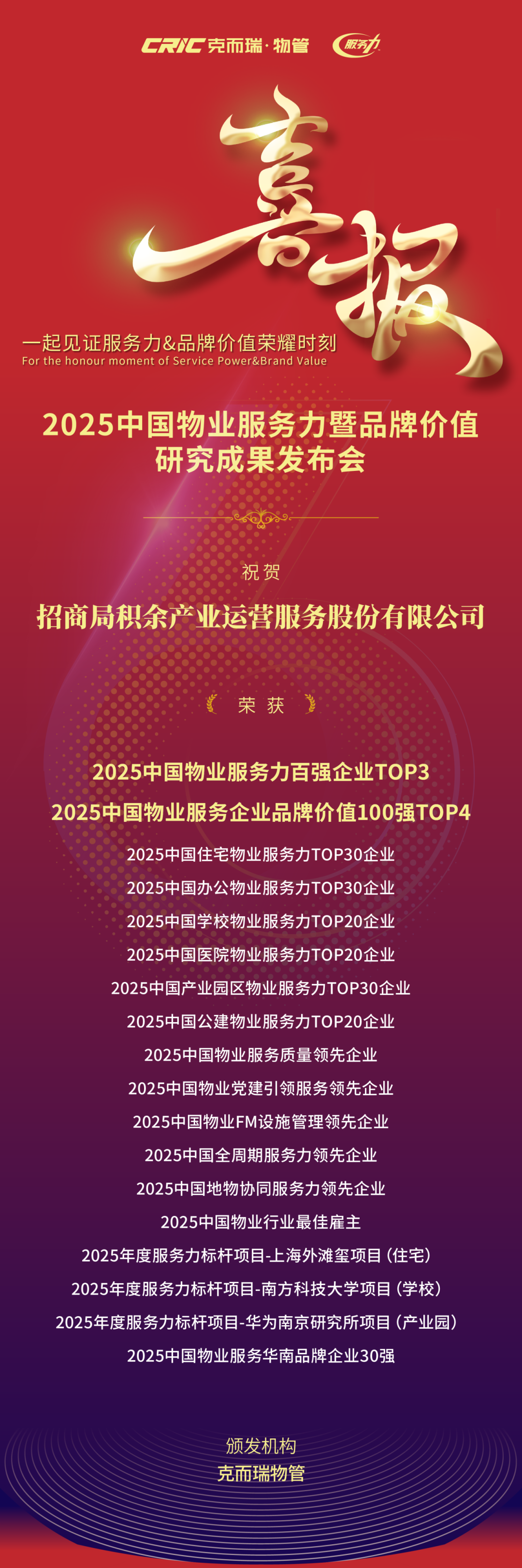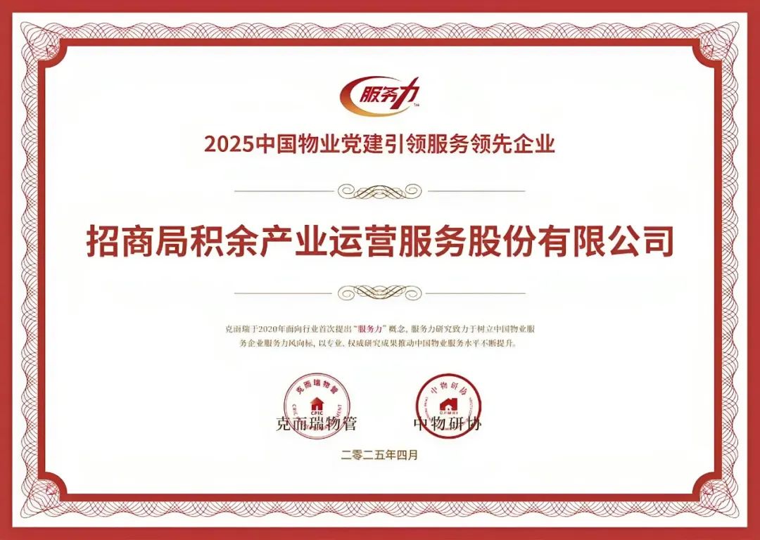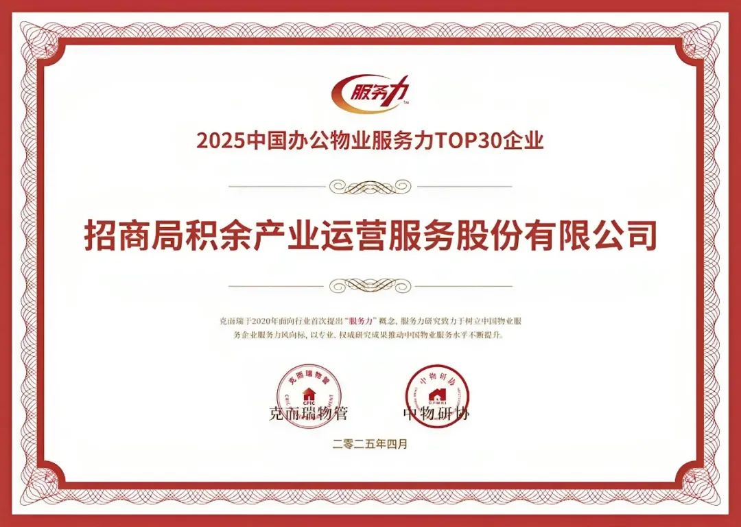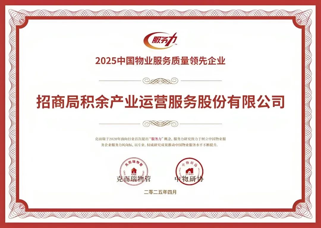 在“2025中国物业服务力品牌价值成果”中,招商积余荣获“2025中国物业服务力百强企业TOP3”、“2025中国物业服务企业品牌价值100强TOP4”等18项奖项。