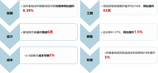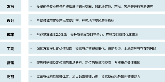 “一城一模板”举措将对标管理作为核心抓手,基于与标杆企业差距来建立目标标准,实现效率的全面提升。主要围绕“发展、设计、成本、工程、营销、财务”等方面进行全方位对标,集中资源极致深挖项目全周期各环节的提升空间,实现公司综合操盘能力、市场竞争力等方面的全面提升。