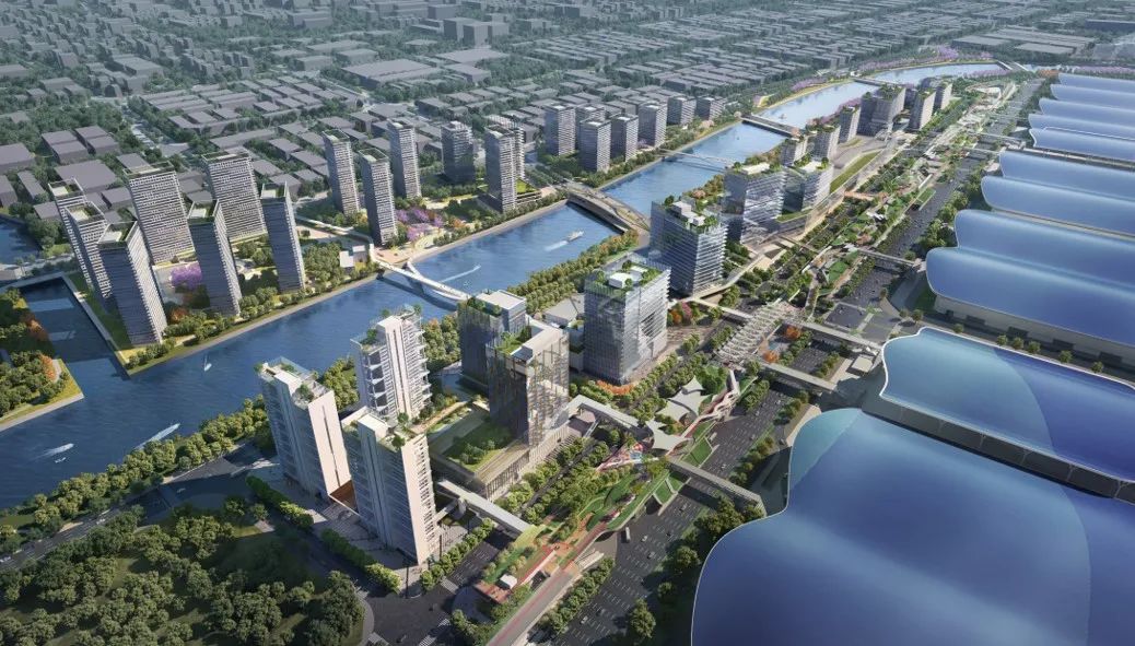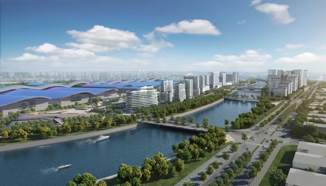 一座50万方的超大型会展中心正坐落于此,加上周边的综合配套用地,整个城区的总建面接近400万方。配套功能区还包含了150万方以上的酒店、办公、商业和商务公寓指标。