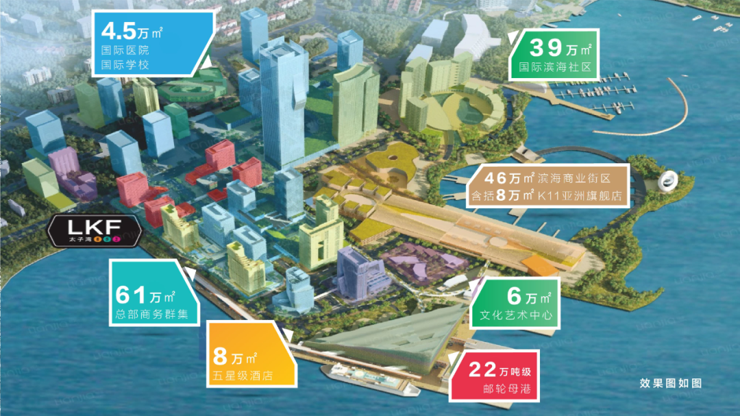 其次,在商业消费方面,临近港口的位置规划了46万方航母级别的商业聚集区。为了匹配蛇口富人区的消费升级诉求,招商蛇口成功与香港K11合作,打造22万方的K11亚洲旗舰店,并引入香港兰桂坊LKF852。