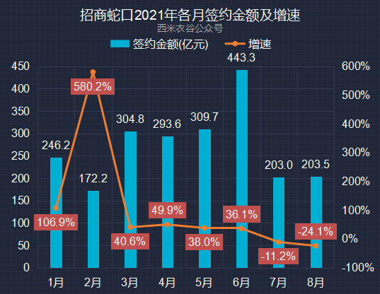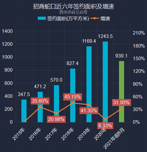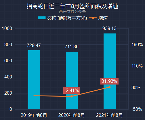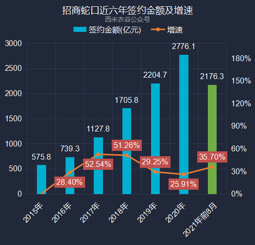 2021年前八月,公司签约金额累计为2,176.32亿元,同比增加35.70%。招商蛇口近六年及2021年前八月累计签约金额情况如下: