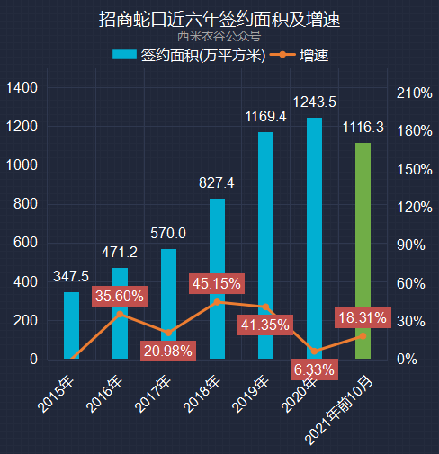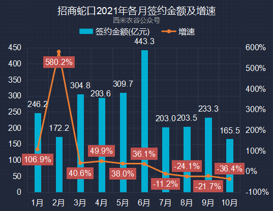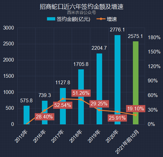 2021年前十月,公司签约金额累计为2,575.06亿元,同比增加19.10%。招商蛇口近六年及2021年前十月累计签约金额情况如下:
