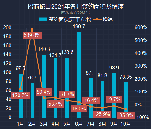 11月9日晚间,招商蛇口发布2021年10月份销售简报:10月公司实现签约销售面积78.35万平方米,同比减少35.90%。公司2021年各月签约面积情况如下: