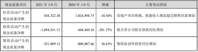 从招商蛇口三季度现金流量表可以看到,2021年1-9月,招商蛇口经营活动产生的现金流量净额为83.43亿元,同比下降18.56%,在项目购地、基建等方面的投入大增,扩张意愿较强。