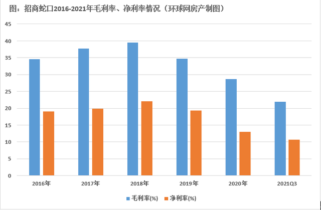 实际上,招商蛇口2021年三季度财务报告显示,期内累计营业收入817.57亿元,同比增长63.13%;归母净利润63.51亿元,同比增长189.76%。然而,反映盈利能力的毛利率、净利率指标却再次下降,报告显示,毛利率为21.93%,相比去年同期的24.32%,下降幅度超过2个百分点,相比2019年同期36%的毛利率水平则下降超过14个百分点;期内净利率为10.67%,相比去年同期6.8%的净利率有所上升,然而与2019年前三季度22.83%净利率的差距仍较大。