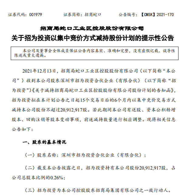 12月13日,招商蛇口(001979.SZ)发布公告称,公司昨日收到股东深圳市招为投资合伙企业(有限合伙)《关于减持招商局蛇口工业区控股股份有限公司股份计划的告知函》,招为投资拟在计划公告之日起15个交易日后的6个月内以集中竞价交易方式减持公司股份不超过2091.29万股,占公司总股本的0.26%,若此期间有送股、资本公积转增股本等股本变动事项,前述减持数量将进行相应调整。