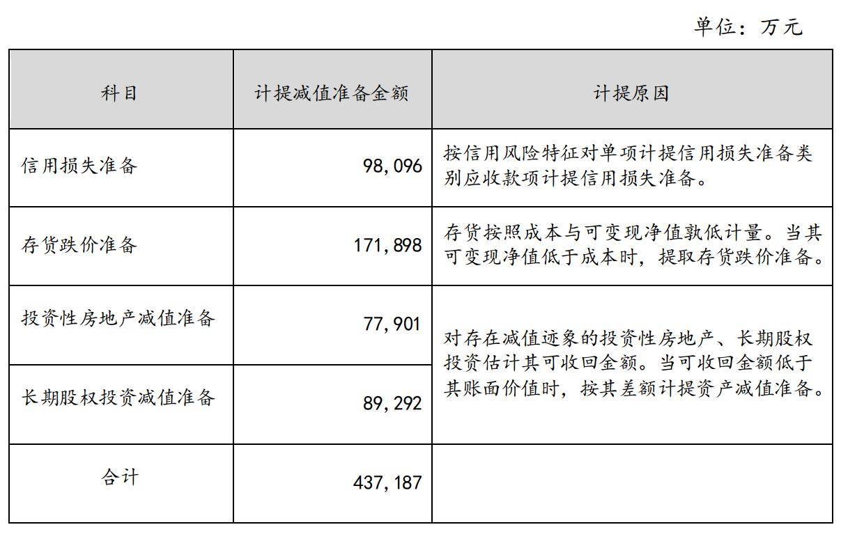 其二:根据减值测试结果,对存货、投资性物业、长期股权投资计提资产减值准备及对重大风险类别应收款项计提信用减值准备共计43.72亿元,减少公司2021年度归属于上市公司股东的净利润34.56亿元,对归属于上市公司股东的净利润的影响同比增加12.72亿元;