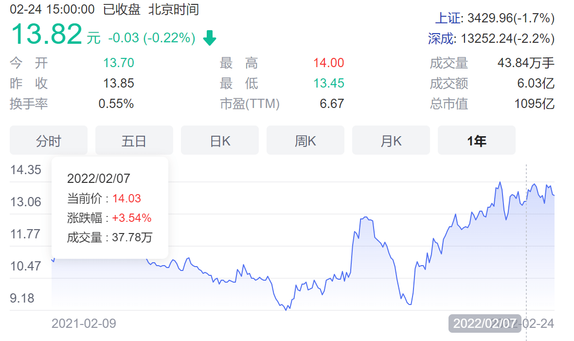 截至2月24日收盘,其每股价格为13.82元,这还是在今年股价回升较大的基础上,去年部分时候甚至跌破10元。