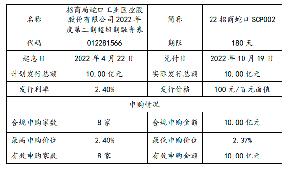 4月24日,招商蛇口(SZ001979)公告,公司于4月21日成功发行了2022年度第二期超短期融资券。