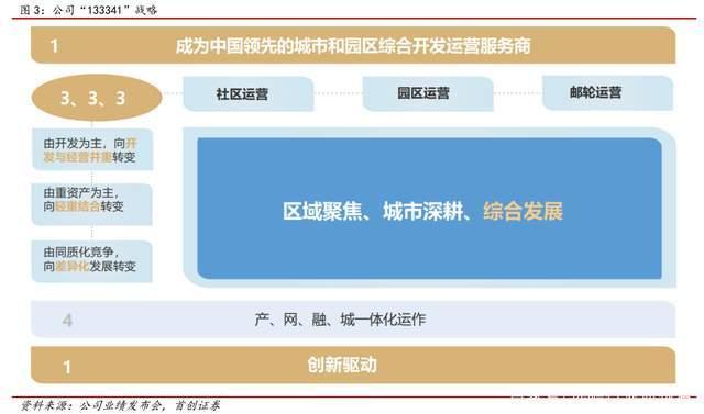 新的战略为 1 个战略定位(成为中国领先的城市和园区综合开发运营服务商)、3 大业务(社区运营、园区运营、游轮运营)、3 大核心能力(区域聚焦、城市深耕、综合发展)、3 种基础策略转变(开发与经营并重转变、轻重资产结合转变、差异化发展模式转变)、4 大业务抓手(产、网、融、城一体化运作)和 1 大驱动力量(创新驱动)。