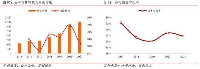 2020和2021年公司拿地总金额分别为1514和2150亿元,分别同比增长55%和42%。权益比也在稳定的提升。拿地金融权益比例由2019年底部的 53.6%提升到 64.4%,2021年小幅下降到57.6%。