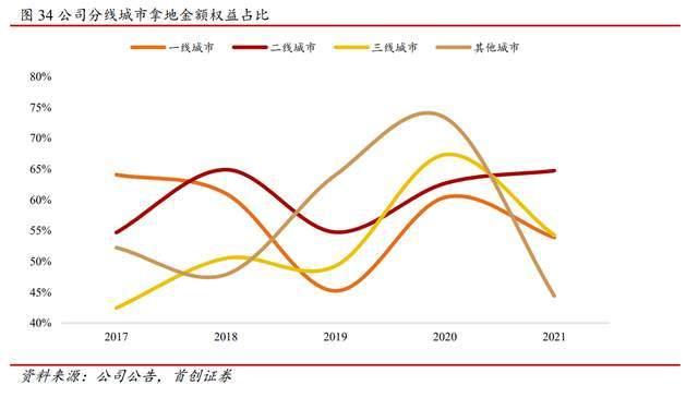具体来看,三线城市权益金额占比从2020年的 67%下降至2021年的 54%,其他低能级城市权益金额占比从2020年的 73%下降到 2021 年的 44%。