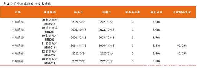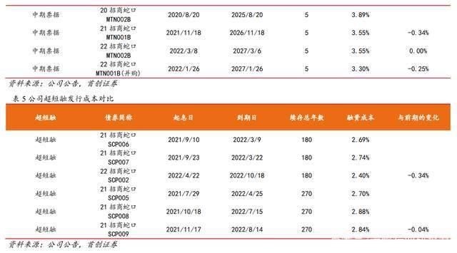 2021年底发行的 3年期中期票据,融资成本 3.23%,较上期下降 53bp,而后2022年 3 月发行的同期票据,再度下降 3 个 bp。五年期票据来看,公司为行业内首发并购贷款的公司,融资成本下降 25bp。180 天和 270 天超短融融资成本分别较上期下降 34 和 4 个 bp。