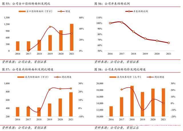 2018年以来,合作项目增多导致公司并表结转比例大幅下降,从2017年的102%下降至2021年的64.4%。并表结转比例的下降导致表内结转面积增速走弱,2017与2018年增速分别为 1.6%和-3.7%,结算节奏明显放缓。
