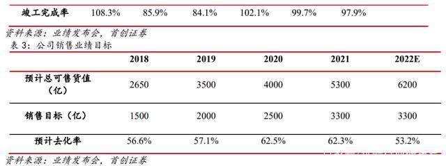 新开工面积的延续高增长将助力后续可售货值的释放,公司在2022年预计可售货值约为 6200 亿元,销售目标与去年持平仍为 3300 亿元,预计去化率 53.2%,较去年下降 9.1 个百分点,充分考虑当前行业的下行趋势。