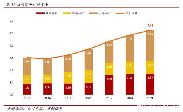 2021年公司的综合杠杆为 7.88 倍,意味着母公司账面股东投入 1 元钱,可撬动 7.3 元的总资产。