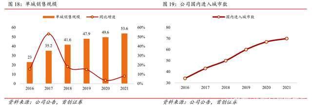 与此同时,贡献销售的城市数量从 34 个扩大超过 1 倍至 70 城,近两年公司新拓展城市个数明显放缓,2021年仅新增拓展 3 个城市。