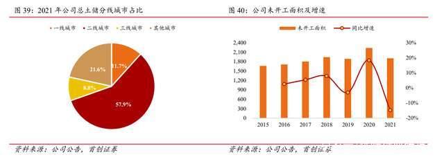 2021年底,公司土储续存比为 3.8,可保证公司未来多年的销售供给。土储结构来看,截至 2021年末,公司 70%土储集中在一二线城市,粤港澳大湾区资源占比 22%,高质量土储保证公司后续销售的去化率及利润率水平,良好的土储布局为公司可持续发展提供保障。同时公司未开工面积 1905 万方,同比下降 15%。