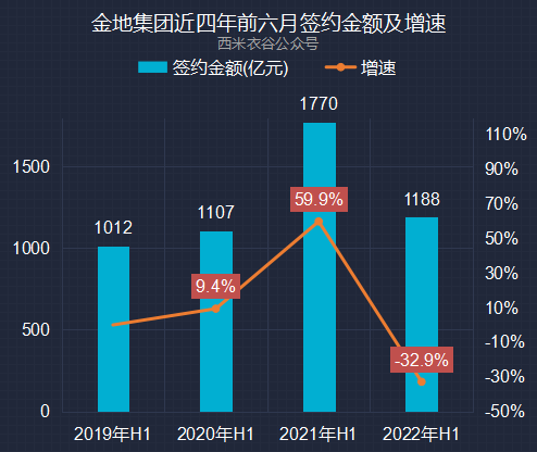 2022年上半年公司累计实现签约金额1188.27亿元,同比减少32.86%。公司近四年上半年的销售金额及增速情况如下: