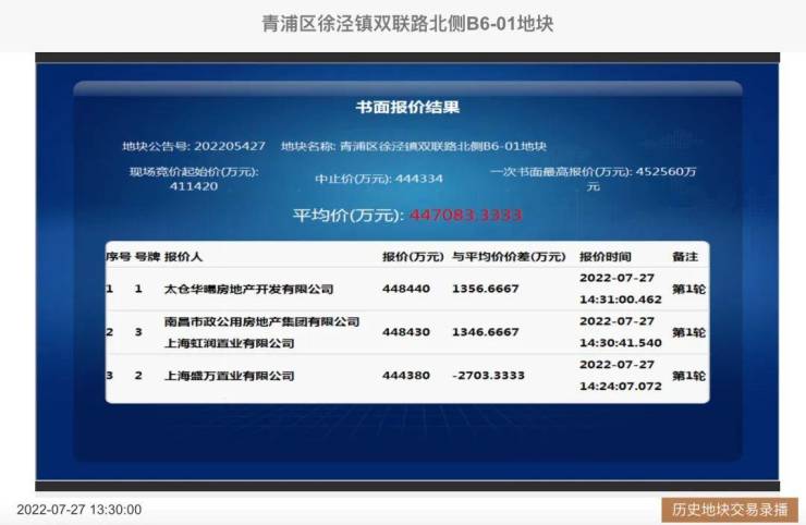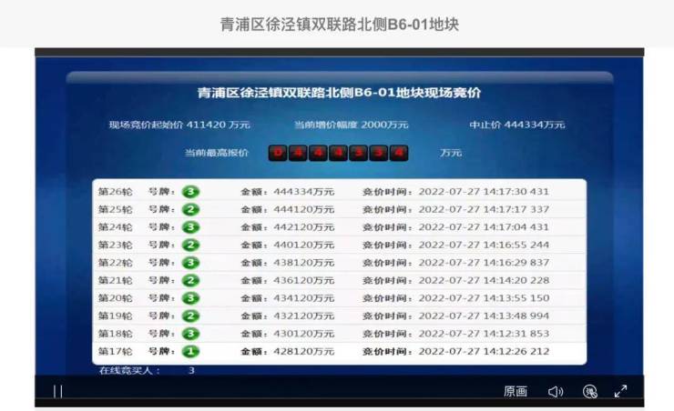 其中,青浦区徐泾镇双联路北侧B6-01地块挂牌出让,共3家竞买人参与现场竞价环节。经过26轮竞价后,报价达到中止价,转而进入一次性书面报价环节。