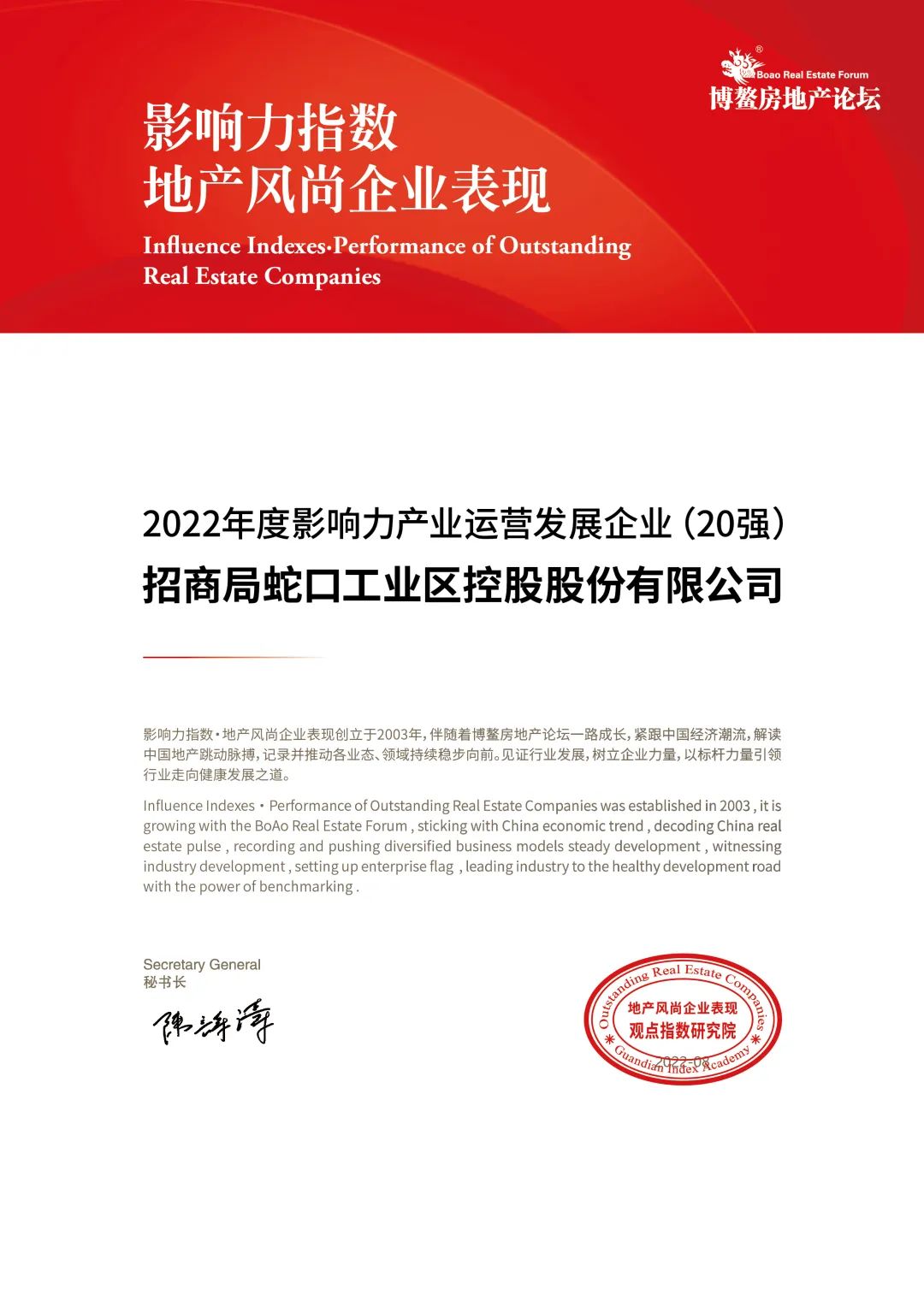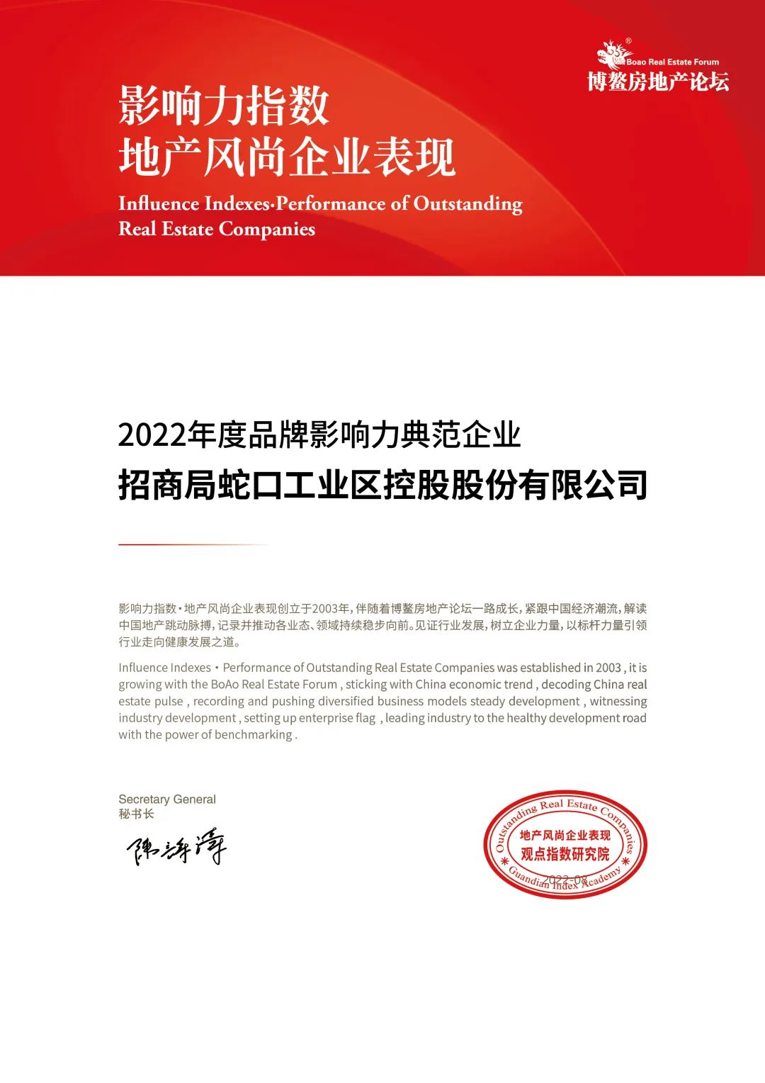 在“影响力指数·2022年度地产风尚企业表现”发布盛典上,招商蛇口凭借“行稳致远、守正创新、卓越追求”的经营管理理念,立足新发展阶段,坚持综合发展模式,促进公司良性循环和健康可持续发展,实力践行“美好生活承载者”品牌主张,获评“2022年度品牌影响力典范企业”、“2022年度影响力产业运营发展企业TOP20”第一名等多项大奖。
