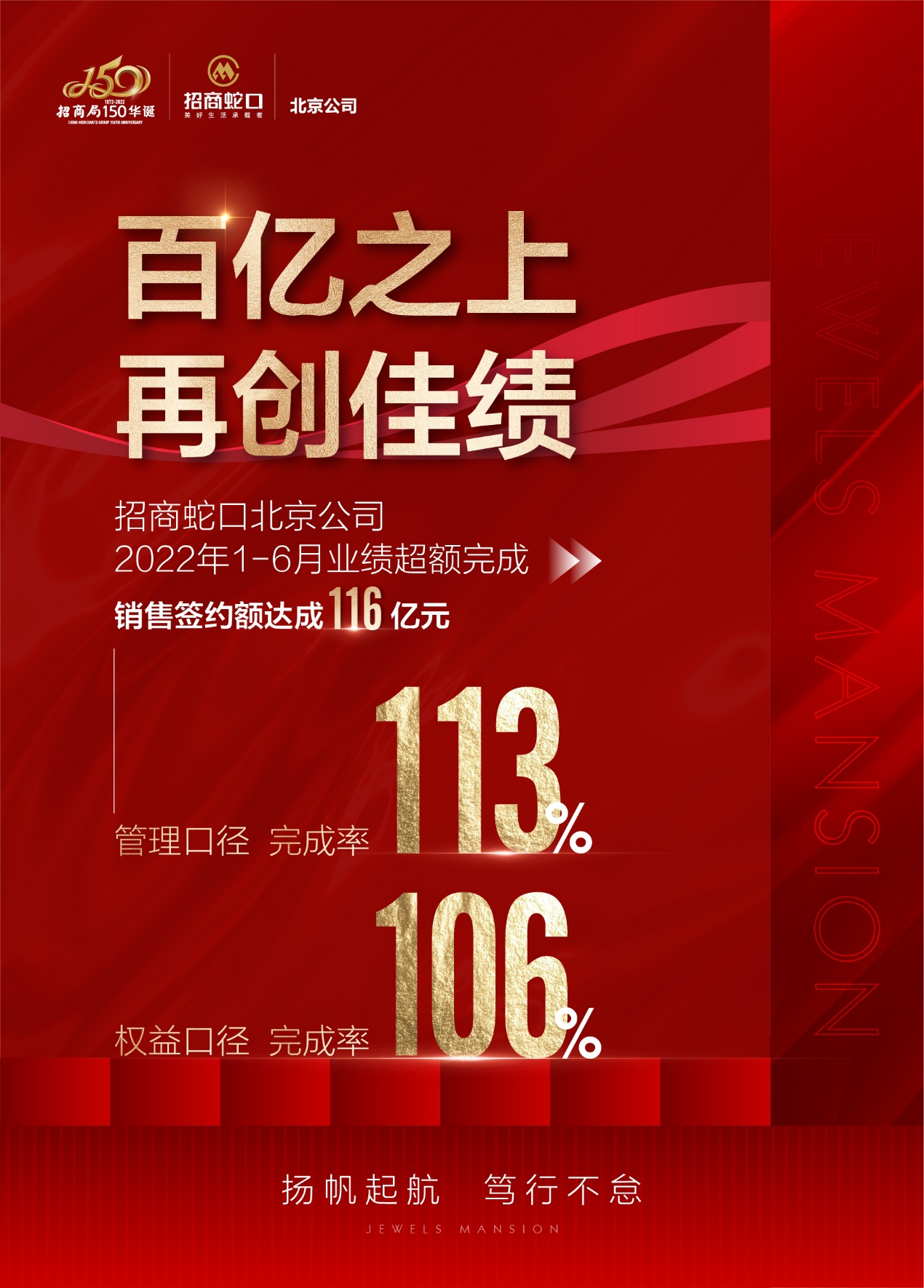 2022年1-6月,招商蛇口北京公司销售签约额达116亿元,位列北京房企销售额排行榜第五名,并荣获“2022上半年北京市房地产10强企业”、“2022上半年北京房地产销售额10强”等一系列荣誉。