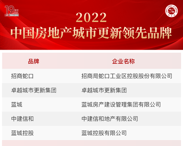 2022年9月15日,由中国企业评价协会、清华大学房地产研究所、北京中指信息技术研究院共同主办的“2022中国房地产品牌价值研究成果发布会”在北京隆重举行,招商蛇口凭借领先的综合实力、出色的市场表现和稳健的财务策略,获得“2022中国房地产行业领导公司品牌”“2022中国房地产产品力优秀品牌”“中国房地产城市更新领先品牌”“2022中国房地产代建领先品牌”等多项殊荣。此外,位于北京的招商城建·龙樾合玺项目获得“2022中国房地产项目品牌价值TOP10(住宅项目)”。