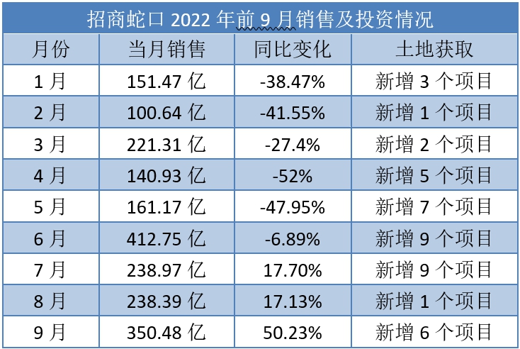 这也是招商蛇口于2022年所获得的次高月度销售成绩。观点新媒体查阅,今年1-9月,招商蛇口的月度销售分别为151.47亿元、100.64亿元、221.31亿元、140.93亿元、161.17亿元、412.75亿元、238.97亿元、238.39亿元及350.48亿元。