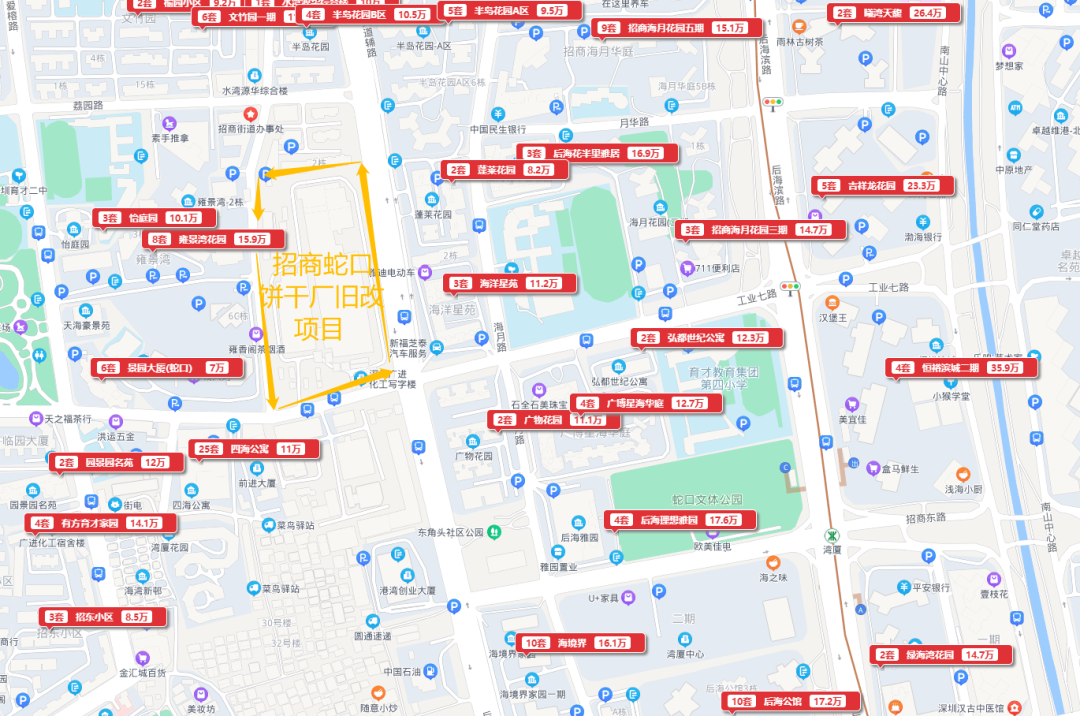 乐有家数据显示,与饼干厂旧改一路之隔的雍景湾,目前二手房挂牌均价约15.9万/㎡,该小区2011年建成,其开发商亦是招商蛇口。
