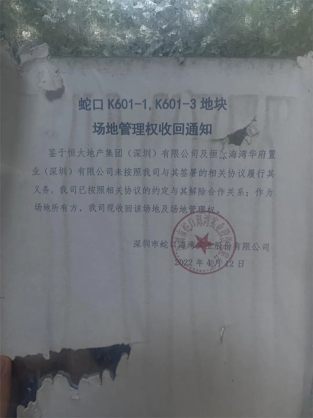 同时,还有一则场地管理权收回通知,由项目申报主体“深圳市蛇口海湾实业股份有限公司”张贴,于今年4月12日发布。
