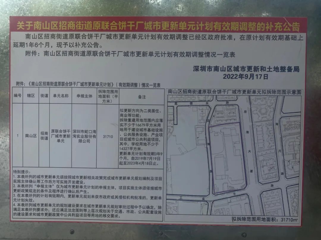 另一方面,因开发商问题被搁置已久的南山区原联合饼干厂城市更新单元(以下简称“饼干厂旧改”),也于近期重启,项目将由央企招商蛇口接手。
