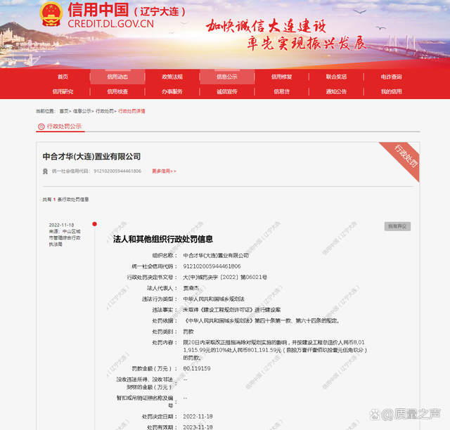 近日,信用中国(辽宁大连)显示,中合才华(大连)置业有限公司存在未取得《建设工程规划许可证》进行建设的违法违规行为。