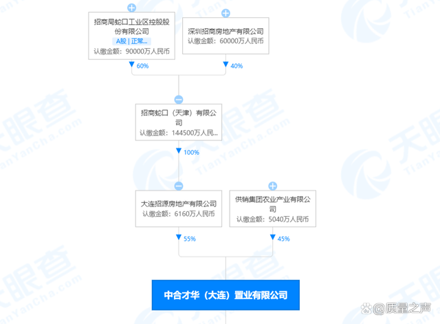 公开资料显示,中合才华(大连)置业有限公司由大连招源房地产有限公司与供销集团农业产业有限公司共同持股,持股比例分别为55%与45%。股权穿透显示,大连招源房地产有限公司是由招商蛇口(天津)有限公司全资子公司。而后者为招商蛇口与深圳招商房地产有限公司共同持股。