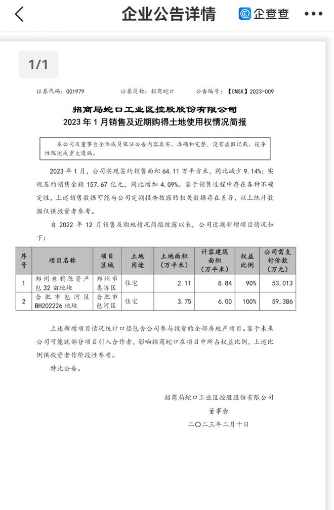 2月10日,招商蛇口披露1月份销售及近期购得土地使用权简报。