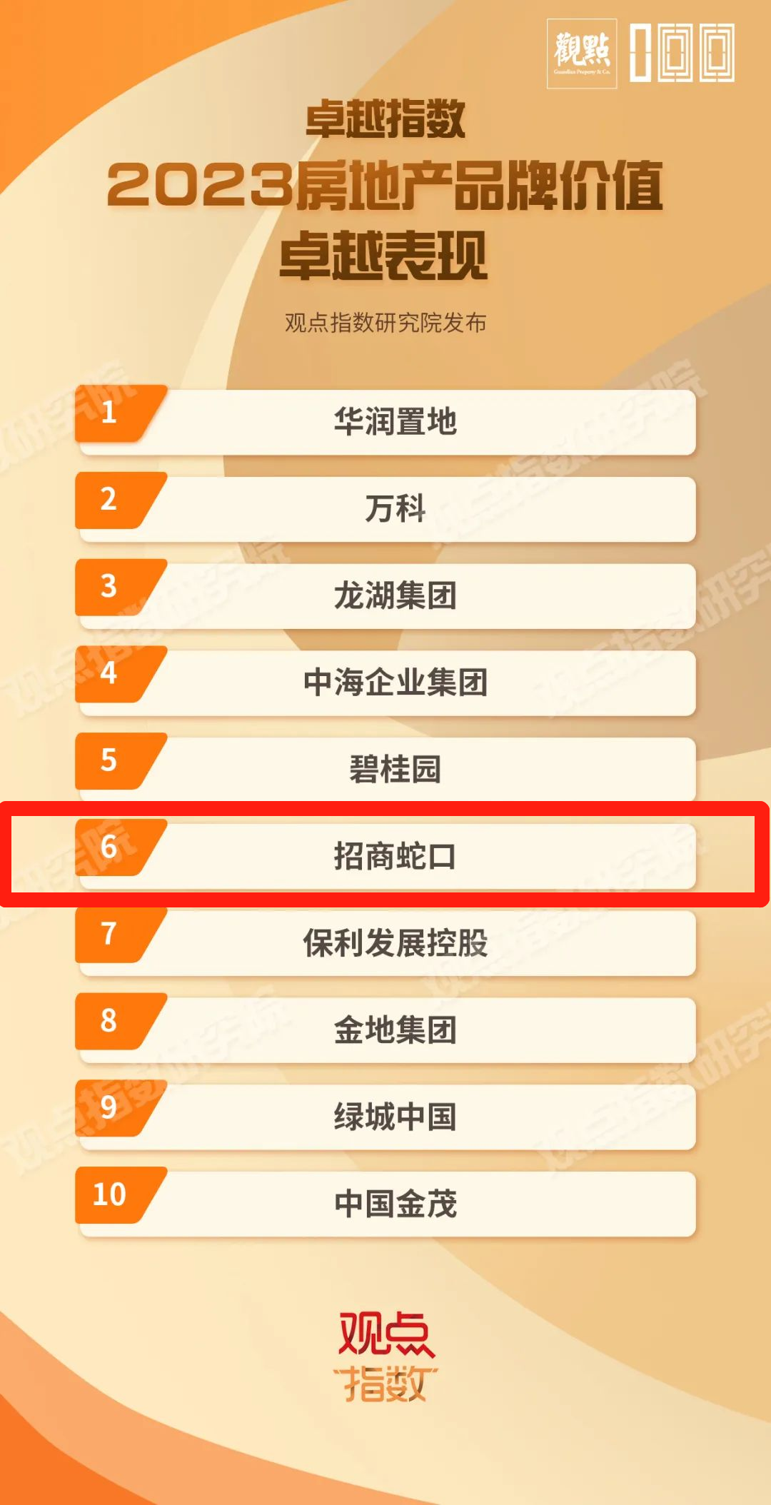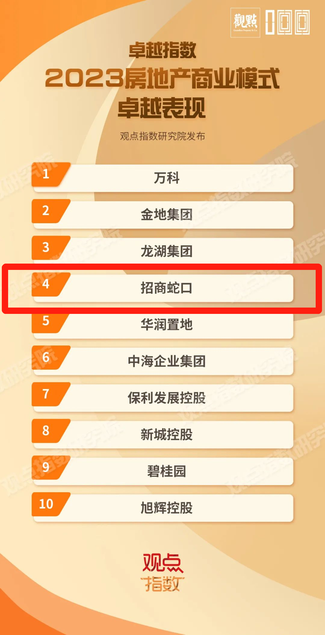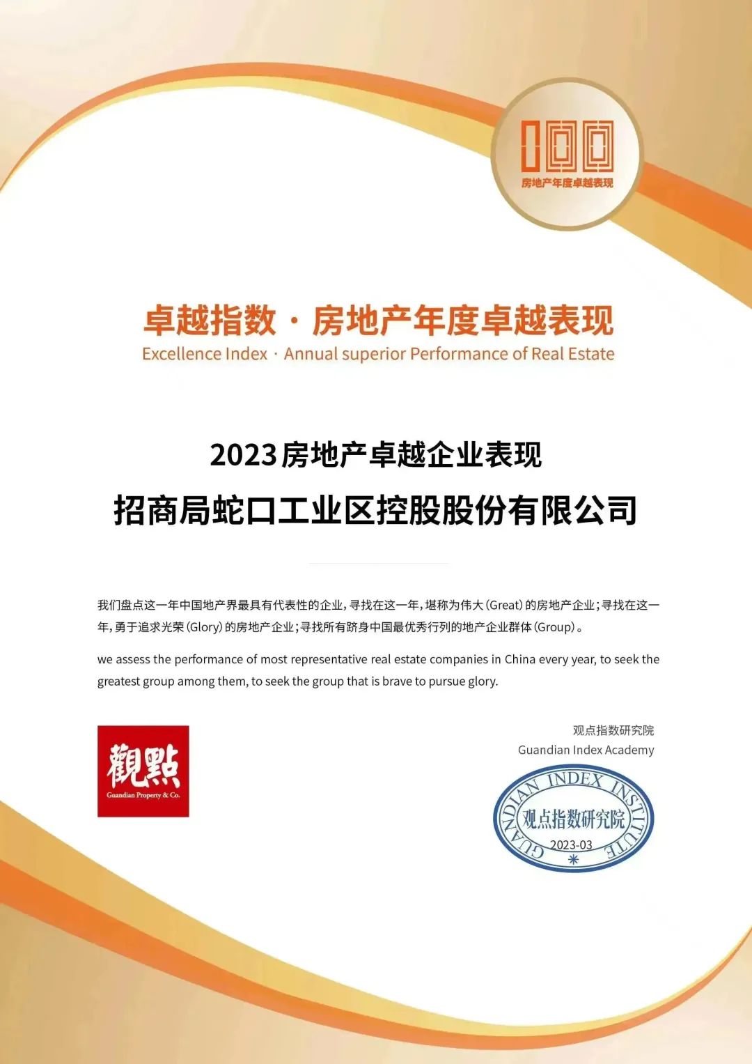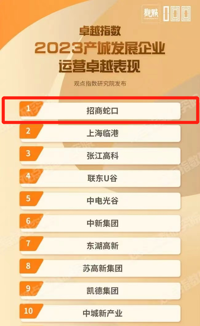 3月22日,“卓越指数·2023房地产年度卓越表现”研究成果由观点机构重磅发布,招商蛇口凭借优秀的综合实力和细分领域的卓越表现,还斩获“2023房地产企业品牌价值卓越表现”“2023房地产商业模式卓越表现”等多项大奖。