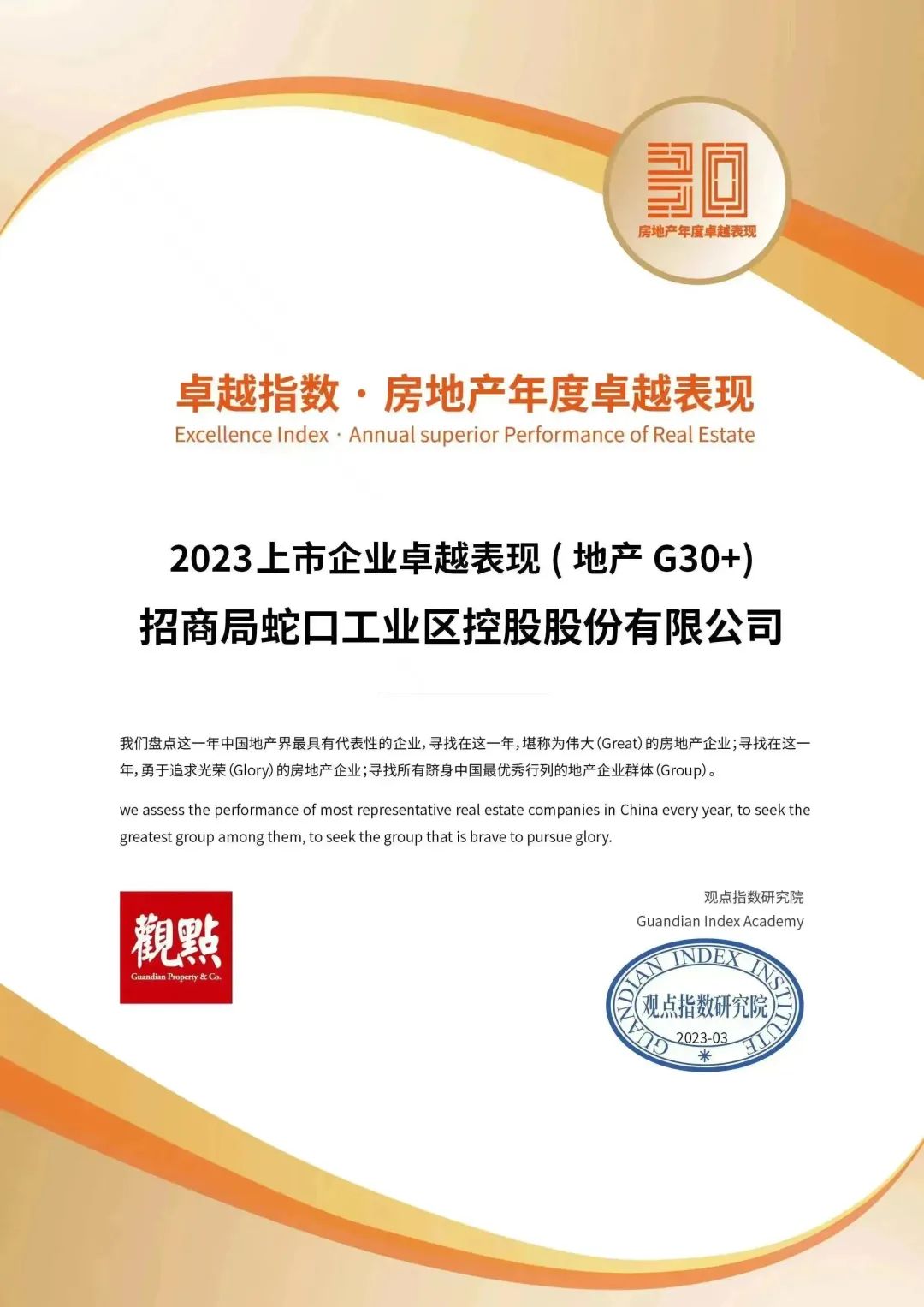 “2023房地产上市企业卓越表现(地产G30+)”