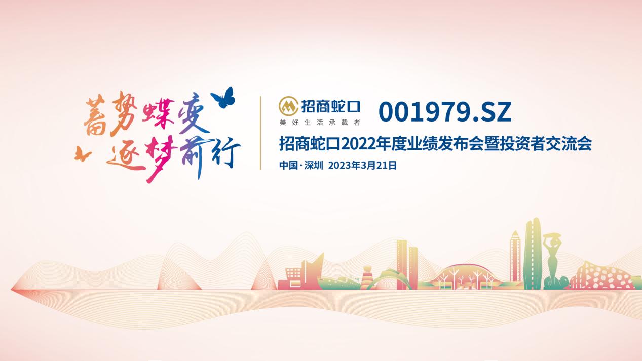 招商蛇口2022年度业绩发布会暨投资者交流会2023年3月21日在深圳成功举行,这是招商蛇口上市以来第八场年度业绩发布会,全景网对本次会议进行了全程视频直播。招商蛇口董事长许永军、总经理蒋铁峰、副总经理聂黎明、财务总监黄均隆、副总经理刘晔先生、副总经理吕斌、董事会秘书余志良出席会议,向与会投资者介绍了公司2022年的经营情况和未来发展展望,并与投资者就公司情况展开深入交流。
