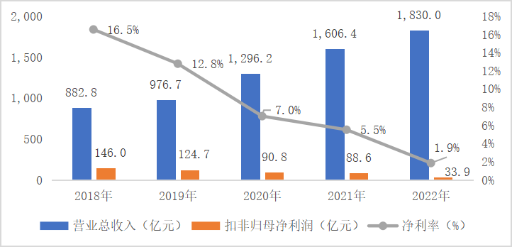 数据显示,虽然公司的总营业收入从2018年的882.8亿元上升到2022年的1830亿元,但扣非归母净利润却从146亿元下降到2022年的33.9亿元;经计算的扣非归母净利率从2018年的16.5%下降到2022年的1.9%。