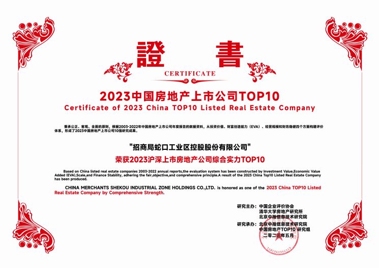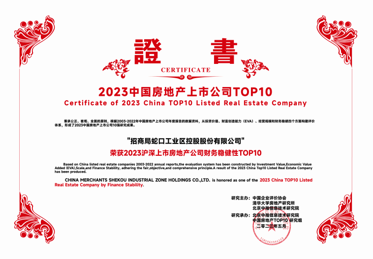 凭借雄厚实力和突出表现,招商蛇口荣获“2023沪深上市房地产公司综合实力TOP10”、“2023沪深上市房地产公司财富创造能力TOP10”、“2023沪深上市房地产公司财务稳健性TOP10”、“2023沪深上市房地产公司投资价值TOP10”等多个奖项。
