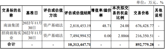 根据国众联出具的《资产评估报告》,截至本次评估基准日2022年11月3-日,南油集团24%股权对应的股东权益评估价值为676,428.77万元,招商蛇口与深投控协商确定本次交易标的资产的交易对价为676,428.77万元,招商前海实业2.8866%股权对应的股东权益评估价值为216,350.51万元,招商蛇口与招商局投资发展协商确定本次交易标的资产的交易对价为216,350.51万元,交易定价与评估结果不存在差异。
