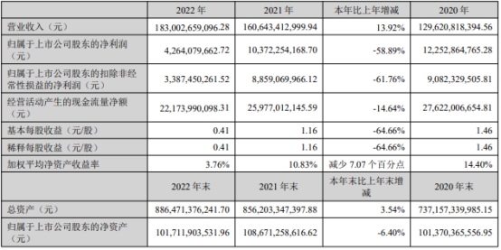 招商蛇口2022年营业收入为1830.03亿元,同比增长13.92%;归属于上市公司股东的净利润为42.64亿元,同比下降58.89%;归属于上市公司股东的扣除非经常性损益的净利润为33.87亿元,同比下降61.76%;经营活动产生的现金流量净额为221.74亿元,同比减少14.64%。