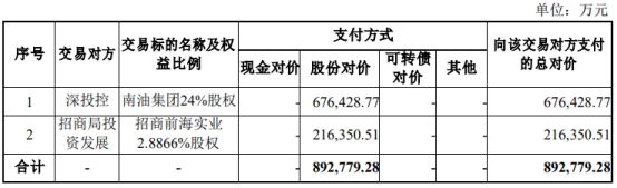 招商蛇口2023年5月30日发布发行股份购买资产并募集配套资金暨关联交易报告书(草案)(注册稿),招商蛇口拟通过发行股份购买深投控持有的南油集团24%股权、招商局投资发展持有的招商前海实业2.89%股权;同时,招商蛇口拟向包括招商局投资发展在内的不超过35名符合条件的特定对象发行股份募集配套资金。交易价格(不含募集配套资金金额)为892,779.28万元。