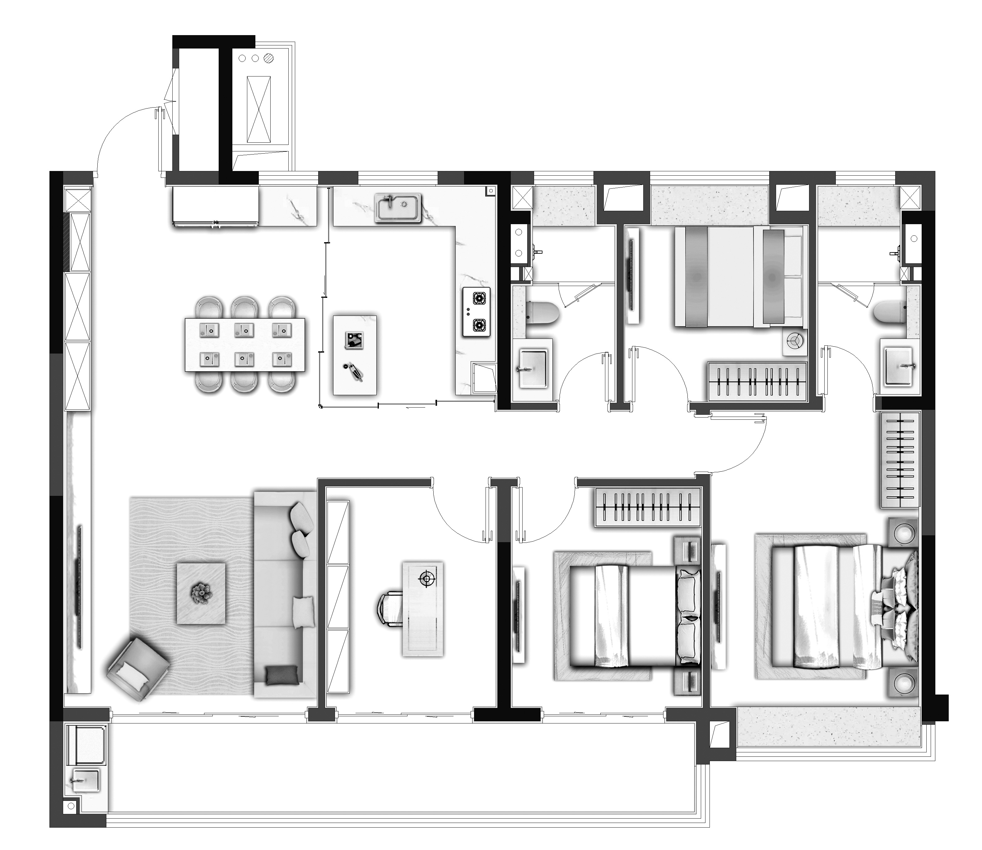 L型开放式厨房的设计,搭配餐厅岛台,造就家庭间更多的互动可能。为三餐乃至平日生活之余,赋予更多社交可能。